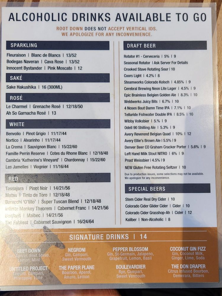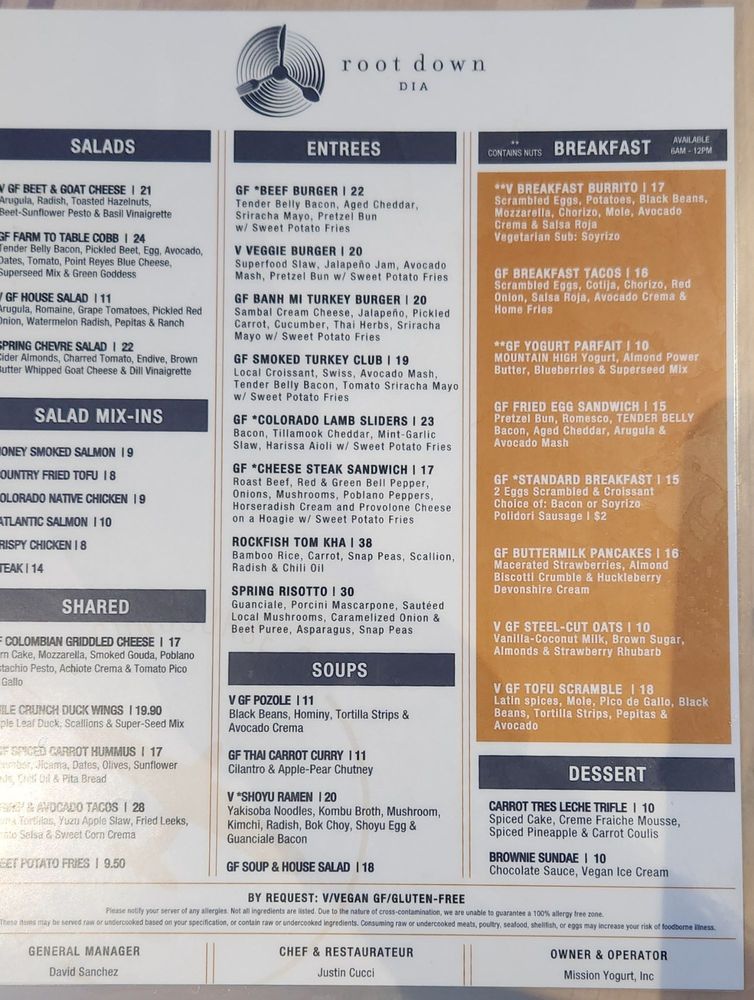 Root Down at Denver International Airport offers a vibrant dining experience with a diverse menu that caters to various dietary preferences. From vegan and vegetarian options to classic American comfort food, there's something for everyone to enjoy. The restaurant boasts a casual, hipster ambiance with amenities like free Wi-Fi, a full bar, and even a pool table for added entertainment. The All Day Menu features mouth-watering dishes like the Banh Mi Turkey Burger with Sambal Cream Cheese and Sweet Potato Fries, or the Beet & Goat Cheese salad with Beet-Sunflower Pesto. The Kids Menu includes favorites like Chicken Tenders and Mac & Cheese, making it a family-friendly destination. Don't miss out on their Happy Hour specials and the best nights to visit on Tuesday, Friday, and Sunday for a lively atmosphere. Root Down is not just a meal, it's a dining experience that is sure to leave you satisfied and coming back for more.